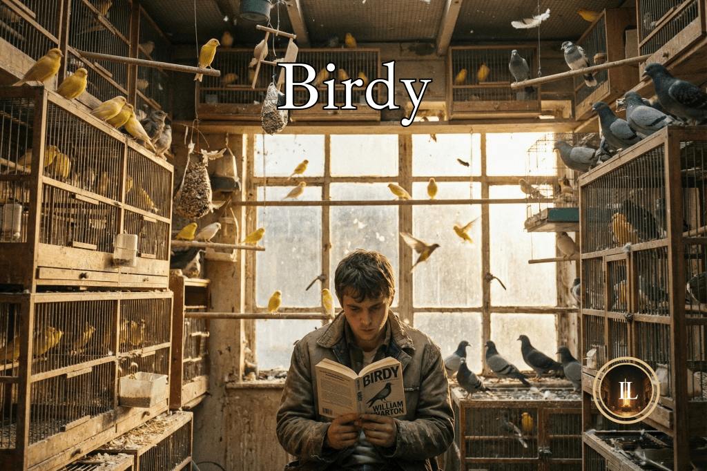 Here, this looks like a gold flake. Wharton dwells on two major themes; flight and insanity. Wharton creates parallels to illustrate ideas. Consider cages: Birdy watches his birds in cages. Al watches Birdy imprisoned. In war, Wharton strips Al of pretense and lays bare his vulnerability and fear; and in the dream Birdy embodies his deepest desires. The birds’ names coincidentally match those of the friends. As humans, they must live in the cage of civilization, unable to survive without its consruct and control. Perhaps mankind has simply accepted insanity as the status quo and condemned sanity to the depths of crazy.